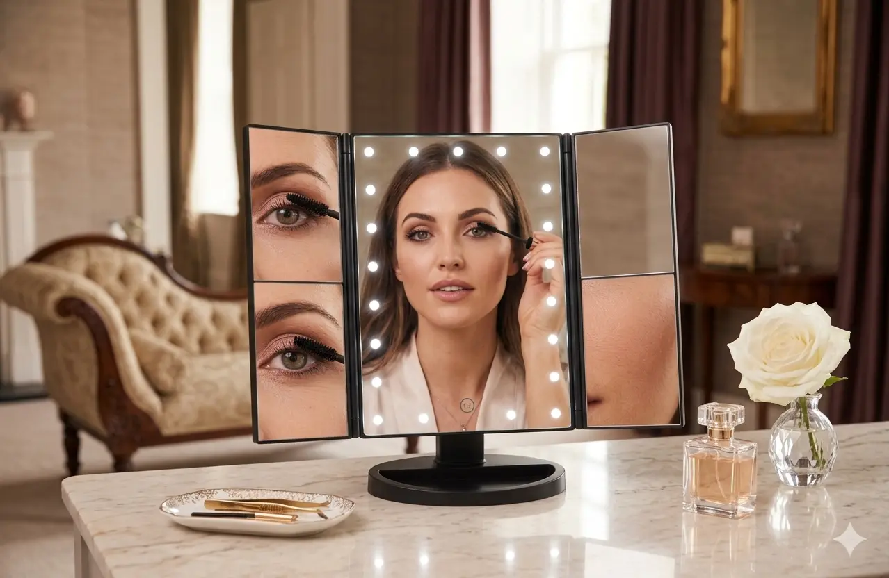 🔹 Iluminación LED regulable (táctil). 💡 🔹 3 Paneles plegables con aumentos. 🔄🔎 🔹 Doble alimentación: USB o pilas. 🔋🔌 🔹 Ideal para maquillaje 💄🧼